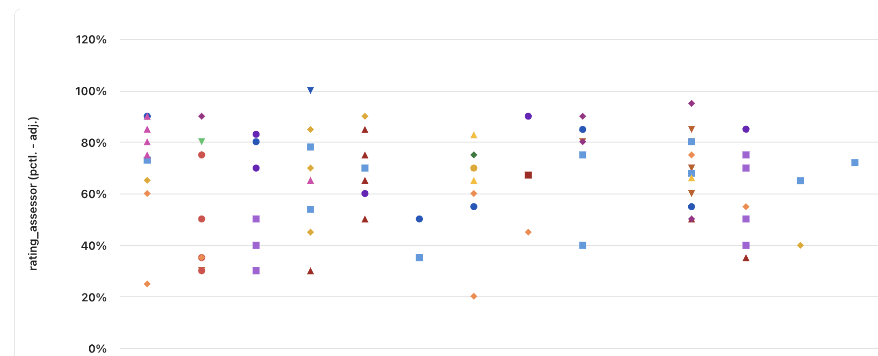 The ‘second opinion’ (‘assessor’) ratings use more of the scale but still don’t seem uniformly distributed … e.g., they rarely go below 30-40th percentile