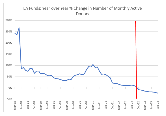 FTX has had an obvious negative impact on the number of donors giving through EA Funds. Since EA Funds was founded in 2017 it had experienced positive year over year growth in the number of monthly donors every single month (albeit at a slowing rate); this lasted until December 2022, the first full month after FTX’s collapse. 2023 has seen declines relative to 2022 of ~10% at the start of the year deteriorating to ~20% in September. September 2023 had the fewest donors of any month since November 2020.