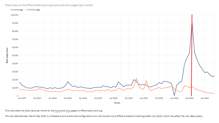 CEA also provides data on traffic to the “intro to EA” page. I think changes in this metric are a reasonable proxy for “changes in traffic we want” (since it captures people trying to learn more about EA). This traffic has been declining steadily since FTX, and the last few months have registered the lowest levels since the data history starts in 2017. This of course suggests that FTX has had a serious negative impact. However, one could also interpret the data as indicating that the post-FTX decline in intro page traffic is actually a continuation of a decline that started in February 2022 and was temporarily interrupted by the release of WWOTF. Clouding this picture further, while we know intro page traffic was lower in June 2022 than in February 2022, unfortunately “data from March-May 2022 is unreliable due to a technical configuration error.”