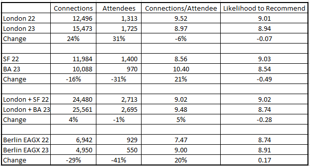 FWIW we now have the EAGxAustralia data up on the dashboard. On a cursory glance, it looks like # connections are pretty similar in 2022 v 2023 (1,941 in 2022, 2,134 in 2023). Same goes for # attendees (284 in 2022, 290 in 2023, although LTR is a bit lower (9.3 vs. 8.53).