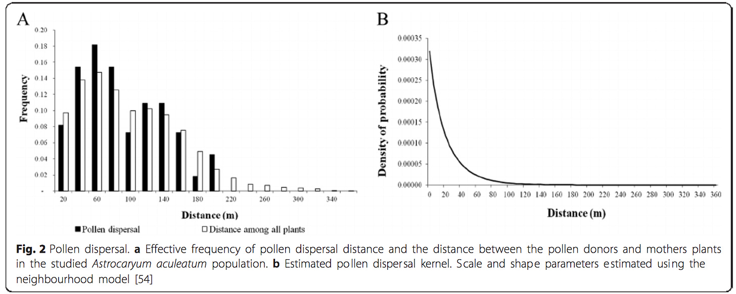 (Source) How pollen disperses over distance in a species of palm. These observations were made when pollen landed on ovules, so these are observations of pollen success. Look familiar?
