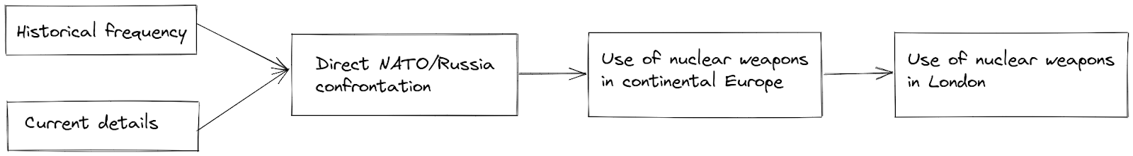 For example, when calculating the chance that a nuclear bomb hits London, we can draw a logic model like: