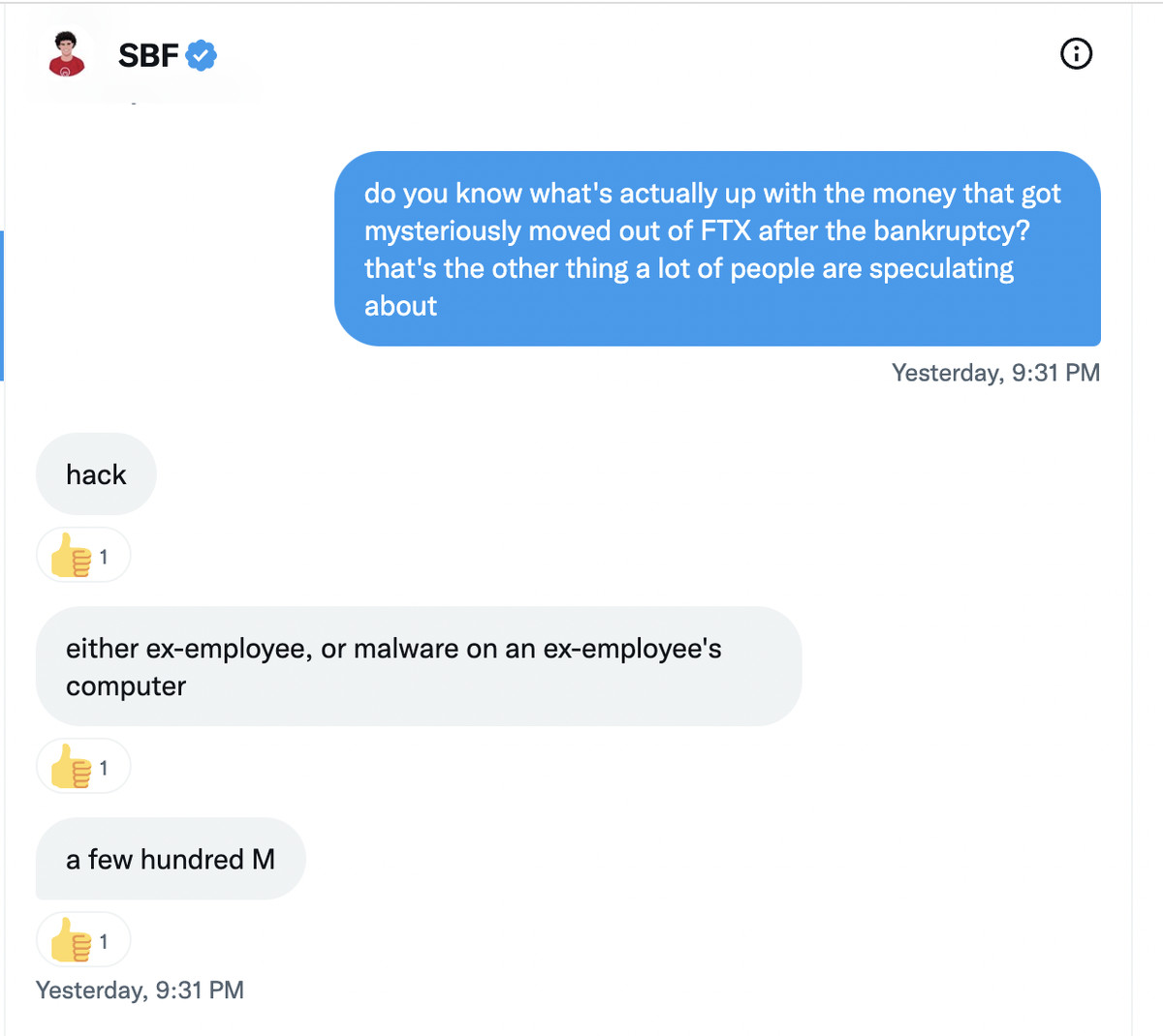 Kelsey gave him three thumbs up when he blamed hundreds of millions moved out of FTX after the bankruptcy filing on a hacker. I doubt she fully believes that explanation—he has no credibility and offered no evidence. More likely is that she’s being friendly to get access. That’s not necessarily wrong, maybe more statements from SBF is a good thing, but we can admit that he’s looking for a friendly conversation and she provided it. Same as the recent NYT interview.