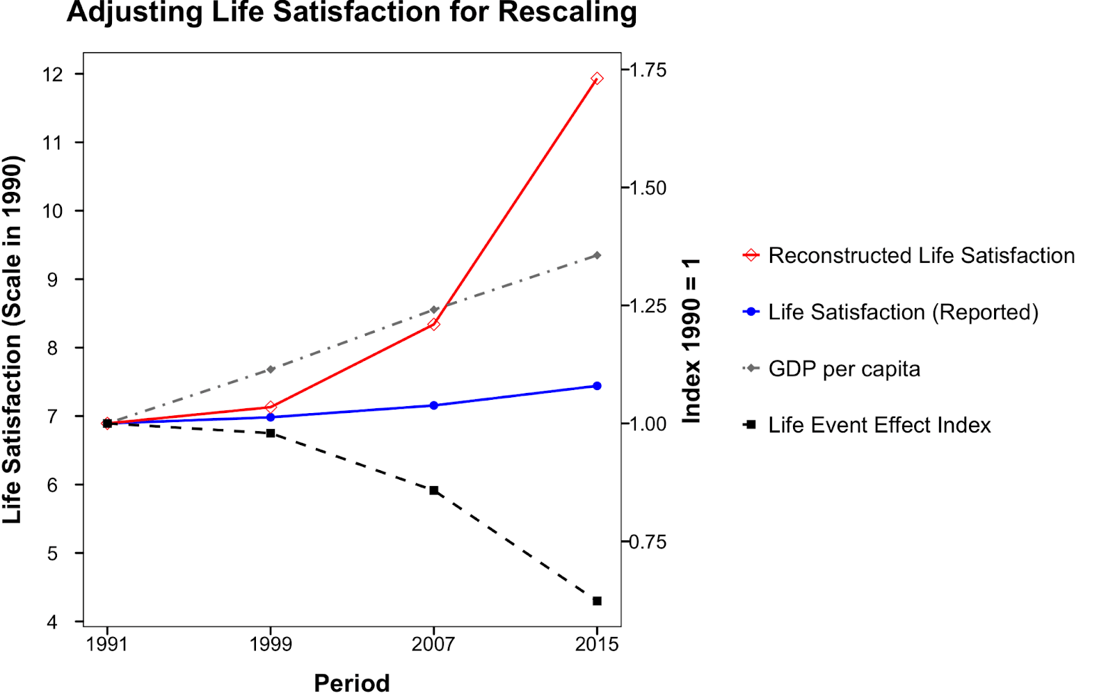 Some argue that happiness is rising, but we’re reporting it more conservatively — a phenomenon called rescaling.