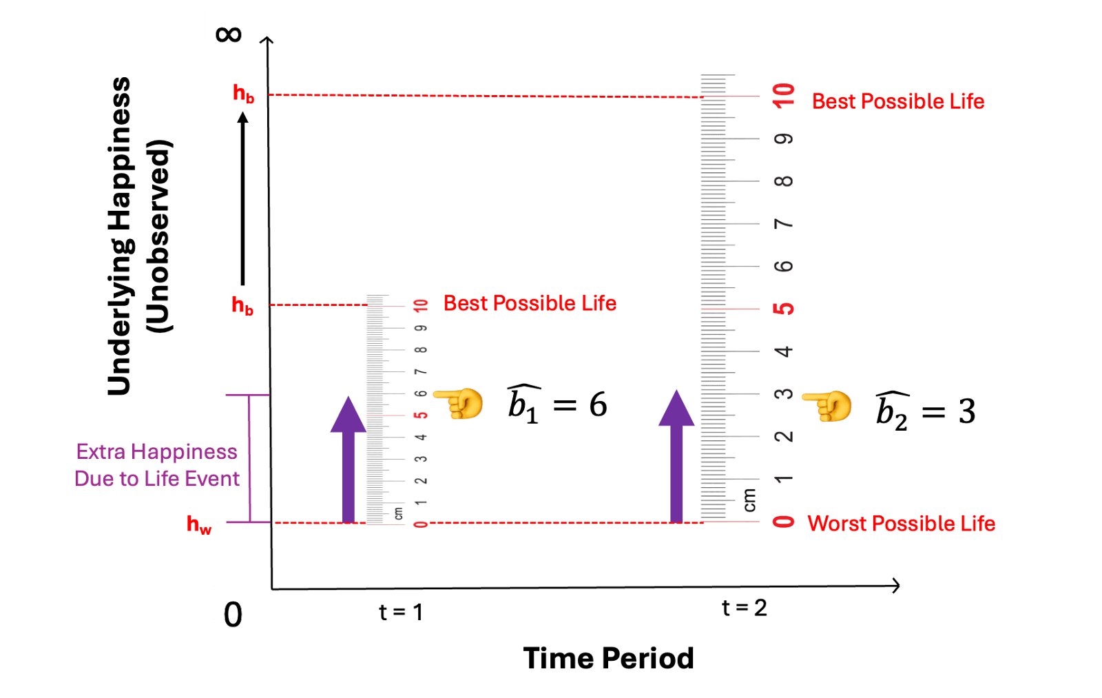 The rescaling hypothesis suggests that the reporting function — how we map our true wellbeing onto a 0–10 scale — changes over time. You can think of the reporting function like a ruler, converting underlying happiness to reported Life Satisfaction. Suppose two people, one from 1990 and another from 2020, both report their Life Satisfaction (LS) = 8⁄10. The second person could be happier, if their reporting function (i.e., their ruler) has either shifted or stretched upwards.