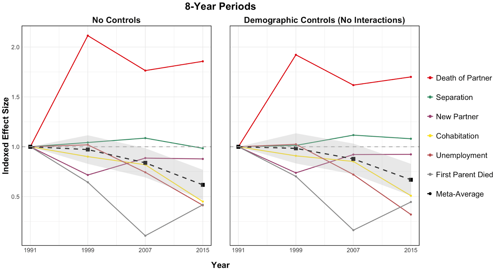 The absolute effects of 3 life events (unemployment, cohabitation, death of parent) were converging to zero, but for the remaining 3 events (death of partner, separation, new partner) the effects were relatively stable. This constitutes some non-definitive evidence for rescaling – which would predict, all else equal, attenuation for all events.
