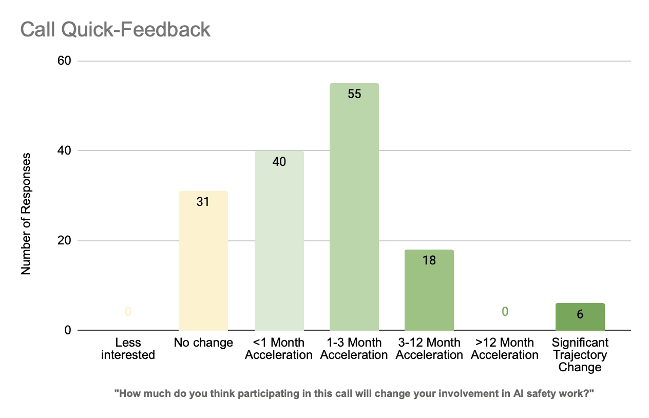 Following each call, we distribute a feedback form to participants. 52% of professionals complete the survey, and of those, 79% report that the call accelerated their involvement in AI safety: