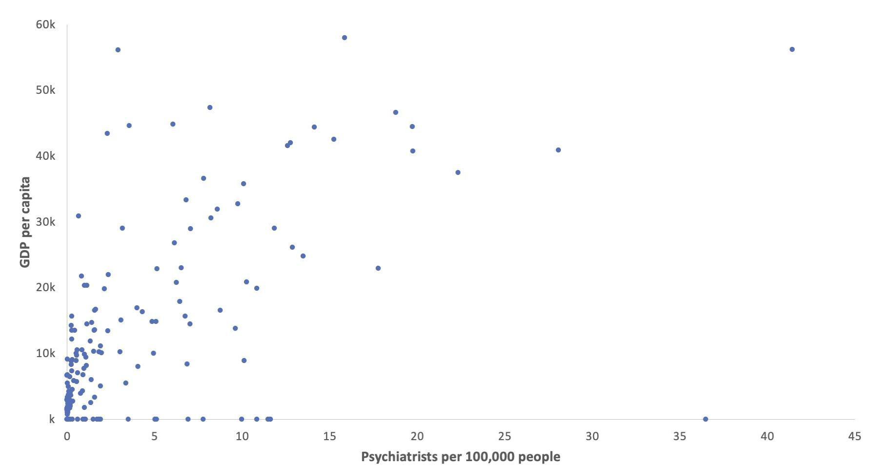 There are also fewer psychiatrists working in mental health in developing countries. For example, Togo has only two psychiatrists working in mental health in a population of 8.3 million people. The chart below shows that psychiatrist density is disproportionately low in developing countries. Among poor countries, a given increase in wealth is associated with a smaller increase in the number of psychiatrists than among rich countries.[5]