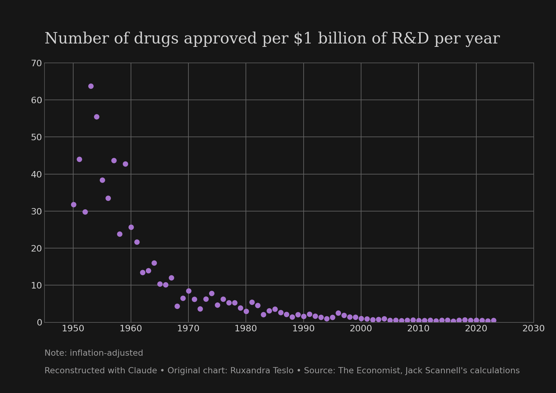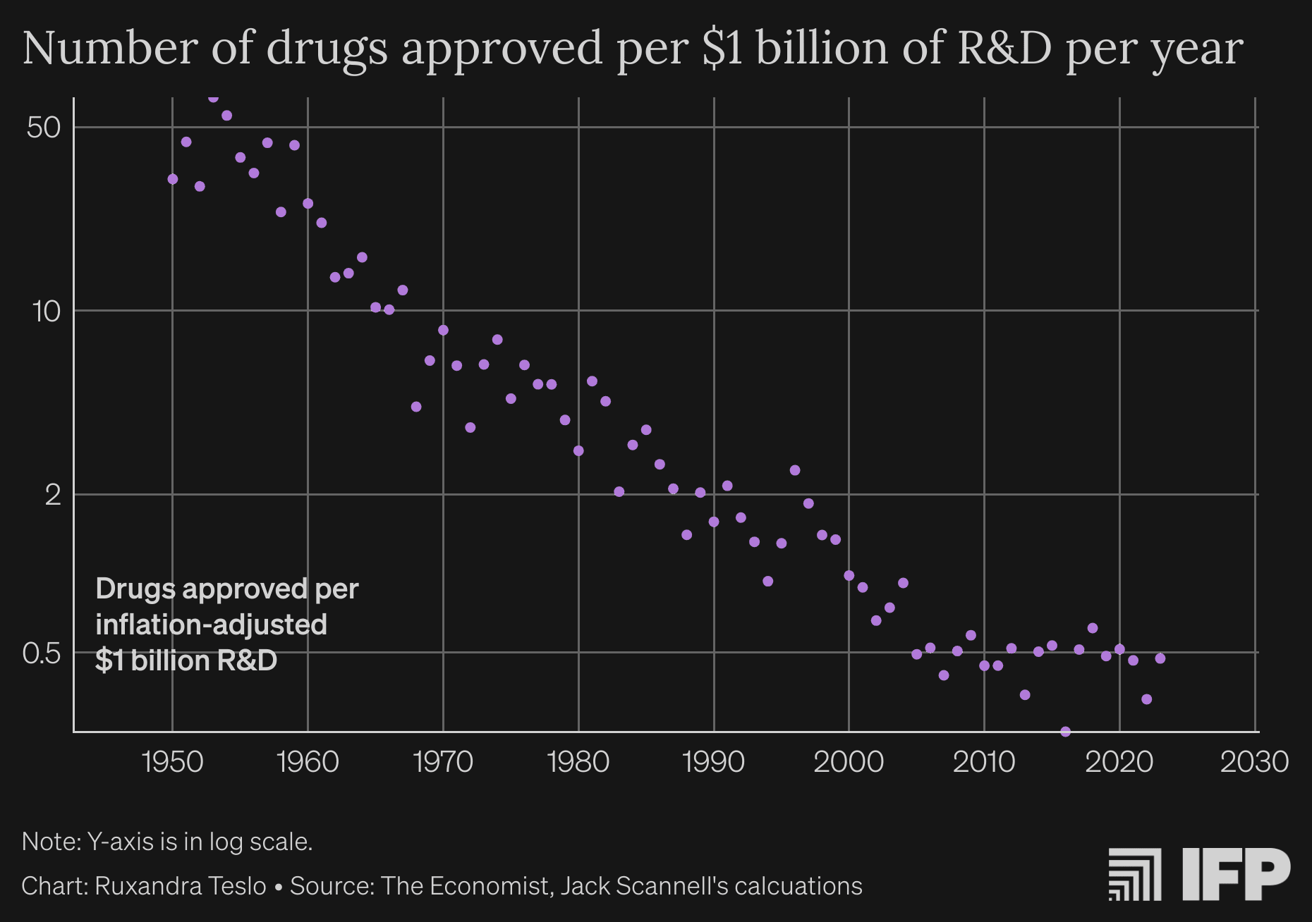 Since the 1950s, the cost of developing a new drug has increased by ~80x. It now costs on the order of a billion dollars to get one drug approved (including the cost of failures). Consequently, fewer drugs get invented, ambitious but risky areas are avoided, and patients pay the price.