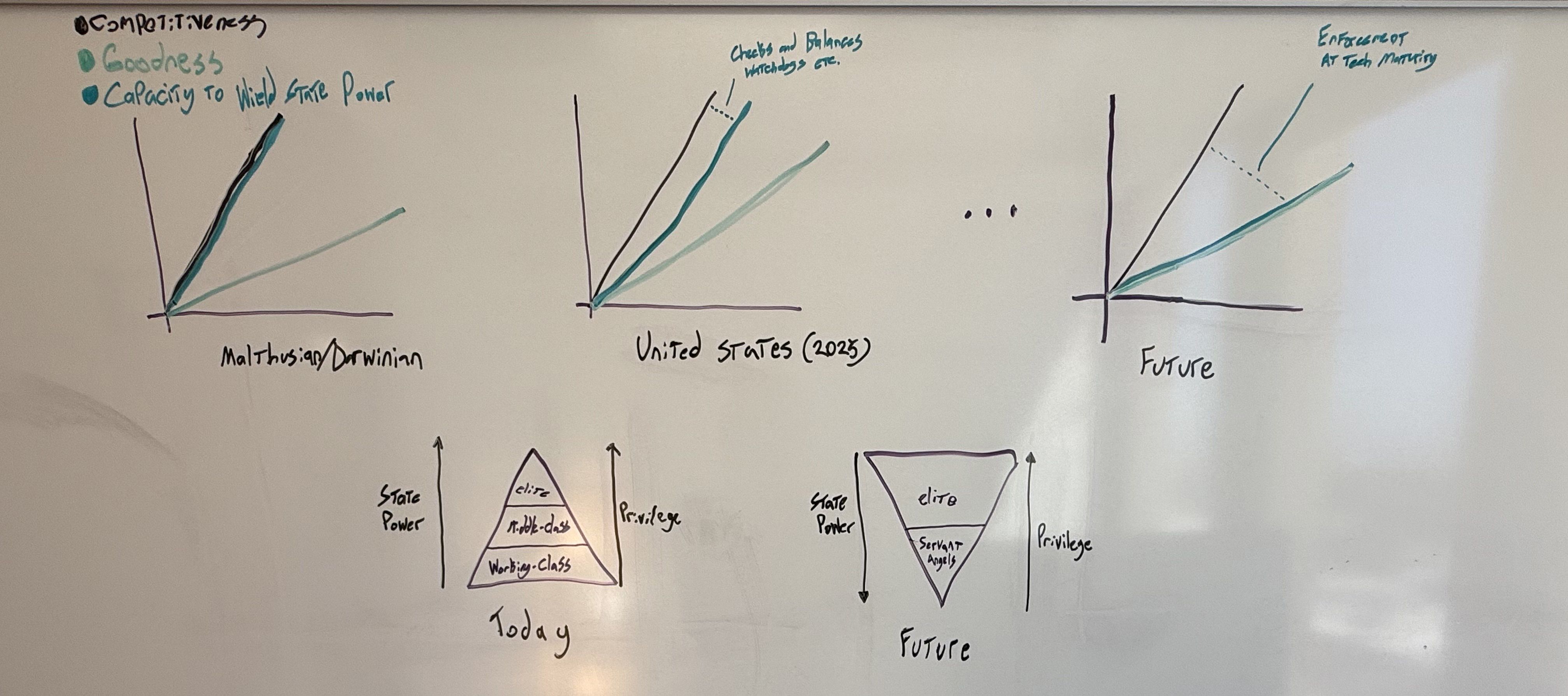 Here’s a picture of what I mean. On the top left, the initial Malthusian/Darwinian equilibrium in which power and competitiveness are highly correlated, then later in today’s US with some checks and balances curbing the extent to which hard power is correlated with competitiveness, then later still in the future if hard power is tightly correlated with goodness. On the bottom, the pyramid of power today stratifies classes with hard power and access to privilege mostly correlated. Then in the future we imagine inverting it such that a large elite class enjoys lots of privilege and has power and agency but not hard power. Hard power is possessed by the ‘servant angels’