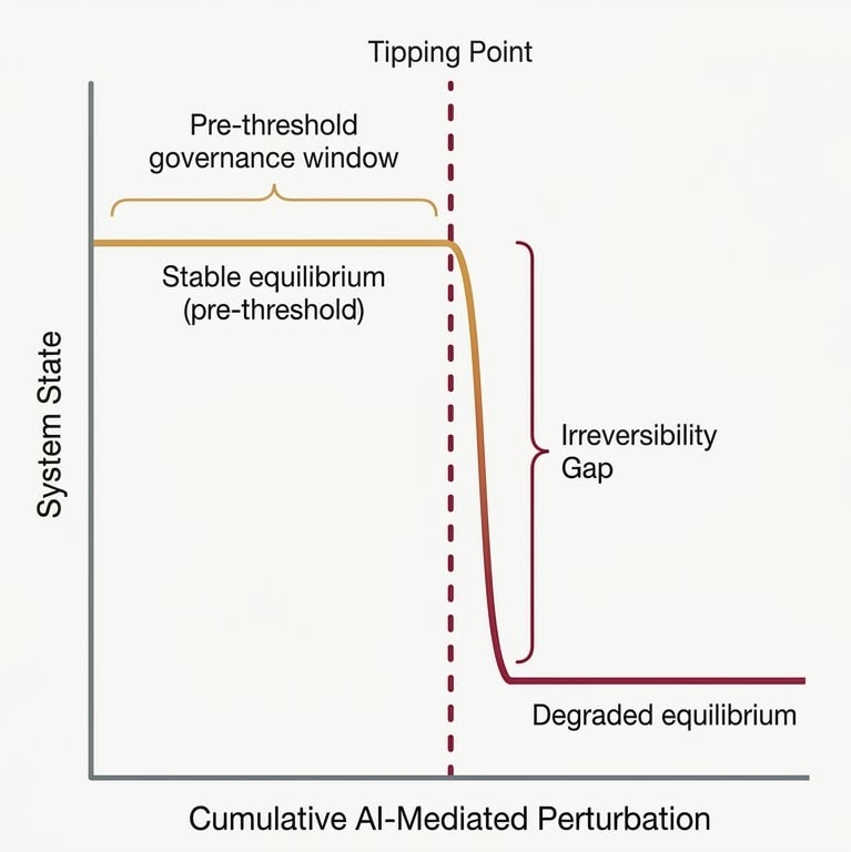 Irreversible AI harms follow the same structural logic. Diffusion across social networks and institutional feedback loops can push social systems beyond a recoverable boundary. Intervention after that crossing can reduce further damage, but it cannot restore the original state.