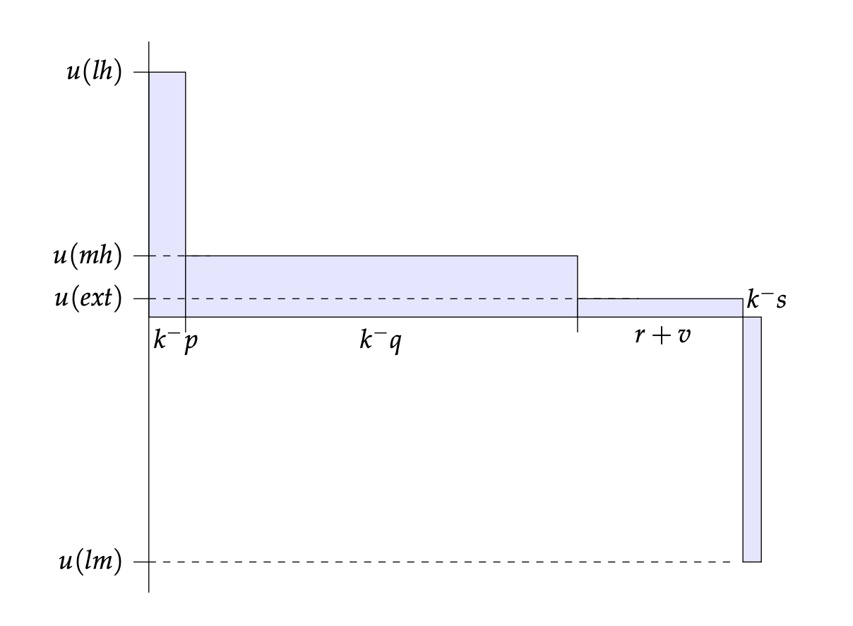 In Figure 5, the area of each rectangle gives the utility of each state weighted by the weight that is applied to it in the calculation of risk-weighted expected utility. For instance, the area of the right-most rectangle is the utility of state multiplied by the risk-transformed probability that will obtain for you at least that utility less the risk-transformed probability that it will obtain for you more than that utility: that is, it is . So the total area of all the rectangles is the risk-weighted expected utility of the option.