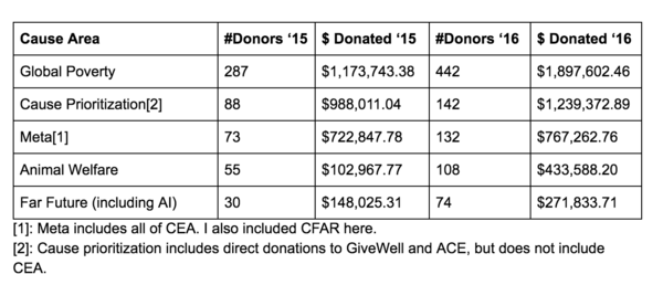 The top twenty donors by donation size in 2016 donated similarly to the population as a whole. The top twenty donors donated the most to poverty charities, and specifically AMF within that cause area. However, the third most popular organisation among these twenty individuals was CEA, which was not one of the top five highest-ranked organisations in aggregate donations for either 2015 or 2016.