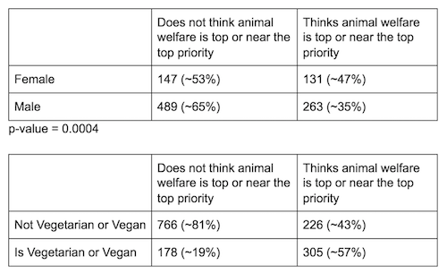 The identification of animal welfare as the top priority was highly correlated with the amount of meat that EAs were eating. The chart below shows the proportion of EAs who identified animal welfare as a top priority according to gender. Considerably more EAs who identified as female ranked animal welfare as a top or near top priority (~47%), as opposed to ~35% males. The second chart shows the dietary choices of those who identified animal welfare as the top priority. Those who identified animal welfare as top or near top priority were overwhelmingly vegetarian or vegan (~57%), much more than the EA rate of ~20%, which looks promising when compared to the estimated proportion of US citizens aged 17+ who are vegetarian or vegan (2%).