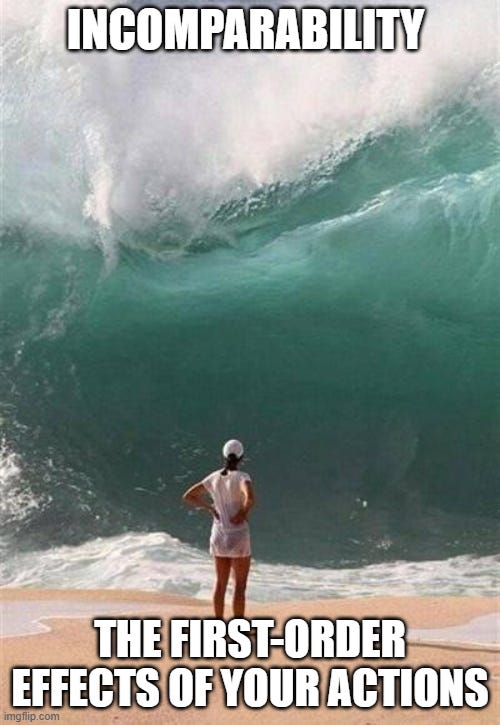 If some goods are incomparable—neither better nor worse—then even small actions (like driving to the store) swap out vast numbers of incomparable goods, rendering those actions neither good nor bad.