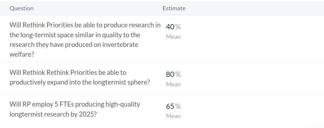 Just for some numerical context, I’m full-time at RP right now and Michael is half-time at RP and half-time at FHI RSP (so we have 1.5 FTEs). At the beginning of 2021, DaveRhysBenard was half-time and Michael was full-time (2.5 FTEs). That said, David was poached internally for some neartermist work (so not sure how to count that, FTE wise). I also spent ~1.5 months on neartermist work (not public). In total, this will be about 1.9 FTE-years by EOY (unless you count neartermist work as not part of the longtermist team), not including new hires.