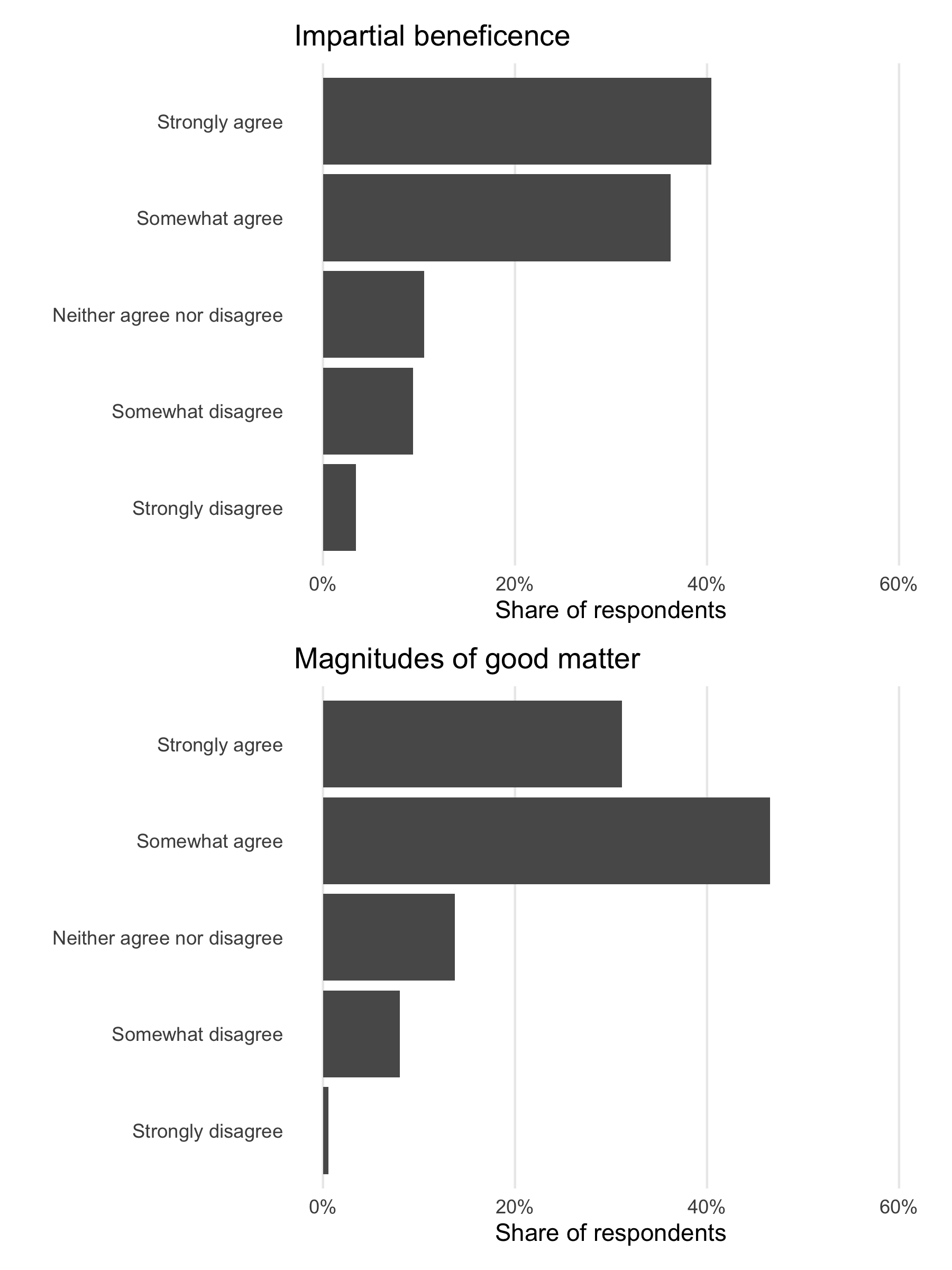 Almost 80% either strongly agree or agree that “From a moral perspective, people should care about the well-being of all human beings on the planet equally; they should not favour the well-being of people who are especially close to them either physically or emotionally” (Impartial beneficence).