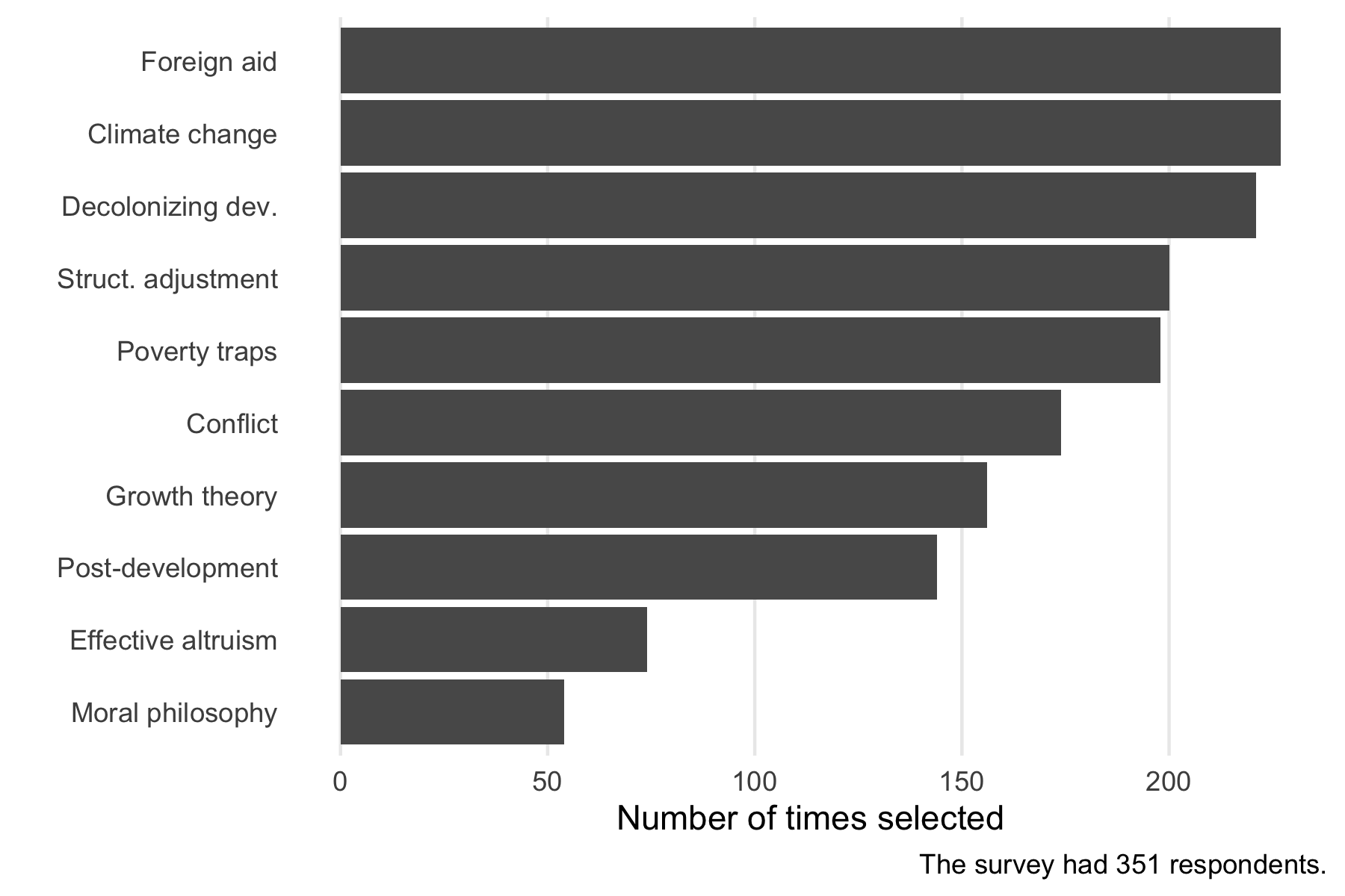 It should thus not be surprising that when I asked which topics a professor would devote at least 30 minutes of class time to in an introduction to international development course, the topics of EA and moral philosophy were the least likely to be covered, by a large margin.