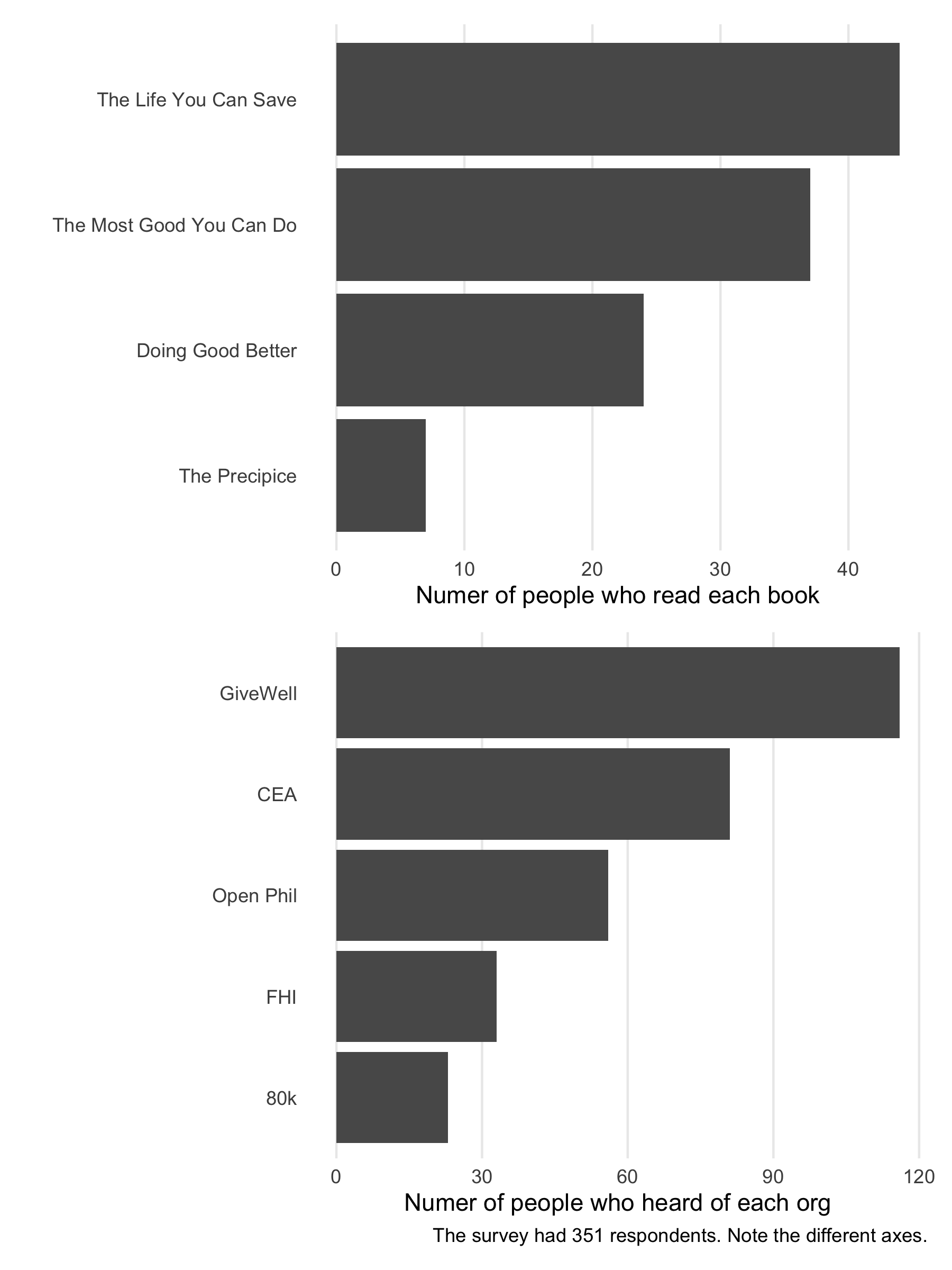 Those who said that they were familiar with EA did better than those who were unfamiliar, but most people were far from the right answers and most answers mirrored the answers of the public at large (see also). This isn’t surprising, as professors are quite specialized and most of us don’t study these topics.