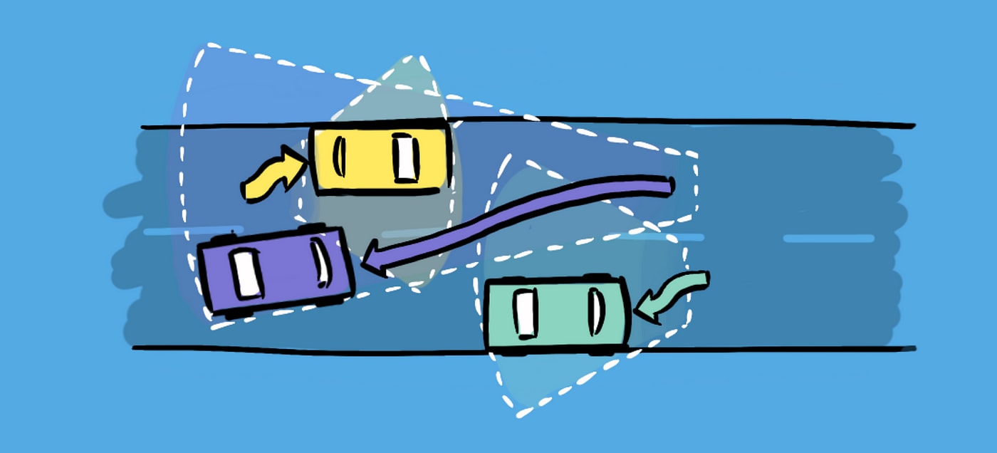There are loads of other human behaviours where we naturally avoid head-on conflict, but one is particularly simple. In game development a standard approach to collision avoidance begins simply by slowing down, which creates a surprisingly natural behaviour between agents, because it’s a behaviour animals naturally adopt.