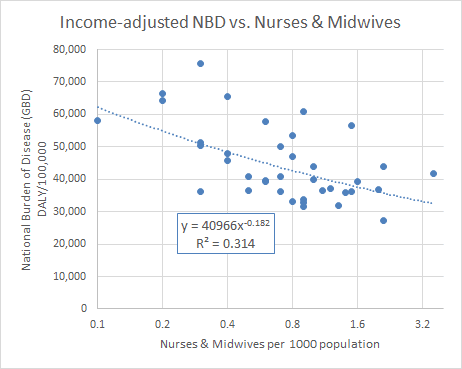 @Robert Van Buskirk adjusted the NBD in Figure 1 to remove the correlation with income. A two-dependent variable correlation analysis indicates that disease burden is significantly negatively correlated to BOTH national average income and the number of nurses and midwives per 1000 population, as one might expect.