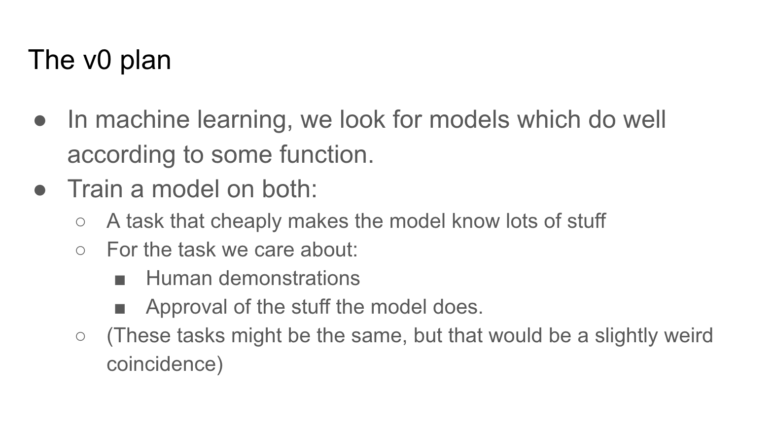 So, let’s talk about the v0 version of the plan. In machine learning, as I’m going to assume you know, the basic shtick is: we look for models which do well according to some function evaluating their output. The most obvious way that we would try to build really powerful AGI right now is, you probably train a model on a mixture of tasks. You probably take some task, where it’s very cheap to train the model on this task. When you train the model on this task, it learns lots of stuff.