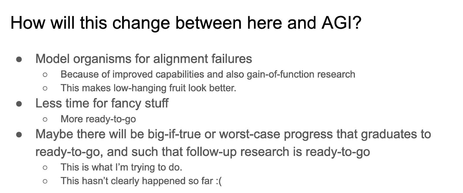How do we think this will change between here and AGI? My best guess as to how this changes between here and AGI is basically: eventually the gain of function people will succeed, and then we’ll have all these great empirical alignment failures, at which point the low-hanging fruit stuff is going to look way better. Currently when the ML academics write these random papers about random unprincipled techniques, I look at it and I’m like, “Well, okay, I can kind of see why you think that would be helpful”, but actually I have no evidence that it is. The demonstration that this is relevant is super sketch. But if we had actual demonstrations of alignment failures, I think that just making a big bag of tricks, where you just try unprincipled things, and see which ones work empirically would look a lot more promising to me.