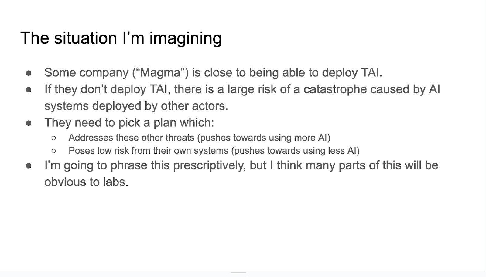 Here’s the situation that I spend my nights worrying about, the situation which I am trying to make go better. I’m interested in the case where there’s some company – Ajeya suggested using the name Magma for this hypothetical company – that is close to being able to build and deploy AI that if they deployed it, would be a massive deal, would be transformative AI, or TAI as we’re going to call it. And they are in a situation, where if they don’t deploy their transformative AI, if they don’t use it somehow, there is a large risk of a catastrophe caused by AI systems deployed by other actors.
