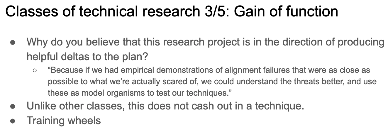 So I’m like, it would be really great, if we had empirical demonstrations of all these failure modes. Unlike the other classes, this gain of function research stuff does not cash out in a technique. I sometimes use this metaphor of training wheels, like we wanna know if it’s physically possible to ride a bike, and currently we’ve just got this dude laying on the ground, and you’ve got a bike, and you put the man on the bike, and he just topples over, and you’re like, “Well, the first thing I’m going to do is I’m going to stick on some training wheels that are very close to the ground”, and then you put the dude on the bike, and tell him to pedal, and he pedals forward a little bit or whatever with the training wheels, and you’re like, “Well, we haven’t established that it’s physically possible for this dude to ride a bike, but we have done one of the intermediate steps: if he couldn’t do this, he definitely can’t ride a bike.”