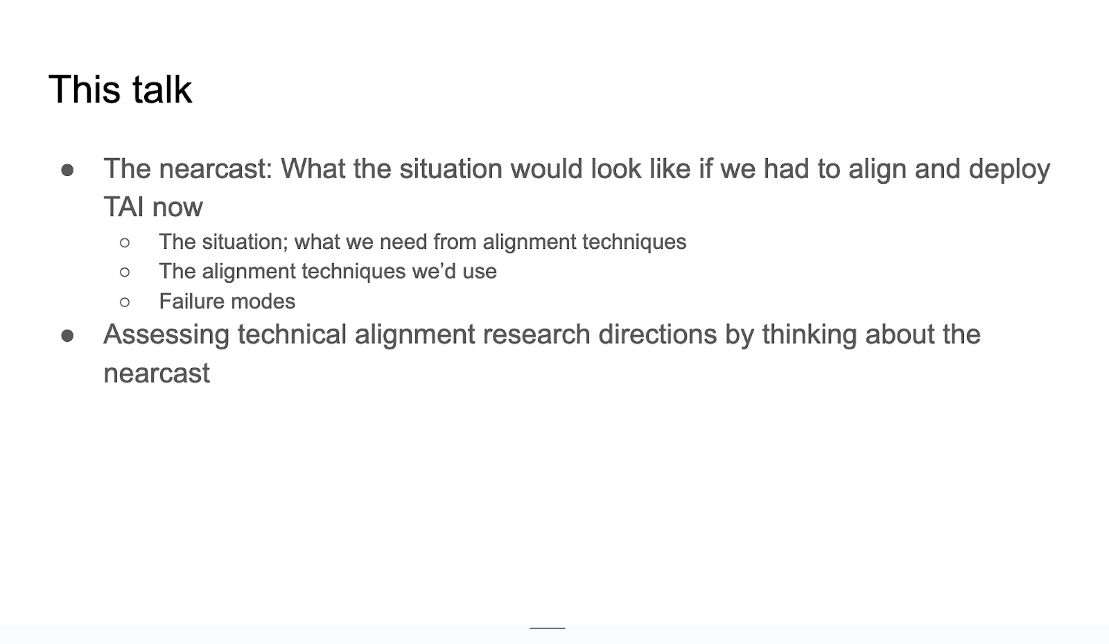 Just to summarize before I get into it, what is going to happen in this talk. We’re going to have two parts. In the first part, I’m going to be talking about the situation that I’m mostly thinking about when I’m thinking about alignment research and what we need from alignment techniques in this situation. I’m going to say what kind of things I think we, just in practice, would use if we tried to do a pretty good job of it pretty soon. And then how I think those might fail.