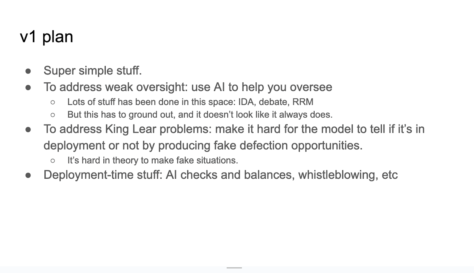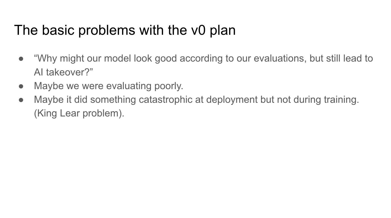 The basic point of the story is, suppose you want to assess someone to answer the question, “What will they do post-assessment, when you’ve already entrusted them with lots of power?” It’s just structurally quite difficult to answer that kind of question because they have this amazing strategy available to them of ‘behave really aligned and then do something else when they actually have all the power’. Okay, so that was the v0 plan. I think people would pretty plausibly try this v0 plan. I think they would pretty plausibly notice these problems. We maybe already have noticed some of these problems. The catastrophe one we don’t notice super much, because the models aren’t smart enough yet to think of doing that, I think. But you know, maybe soon.