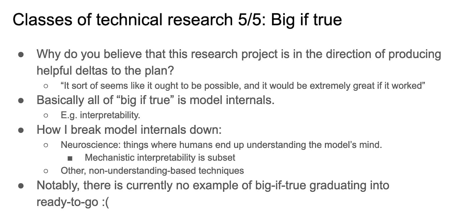 Okay, classes of technical research, 5 out of 5: big if true. In this case, the answer is: it sort of seems like it ought to be possible to do this, and it would be super great if it worked. So this is how I think about almost all of the research on the internals and models, which is, for example, interpretability and some other things.