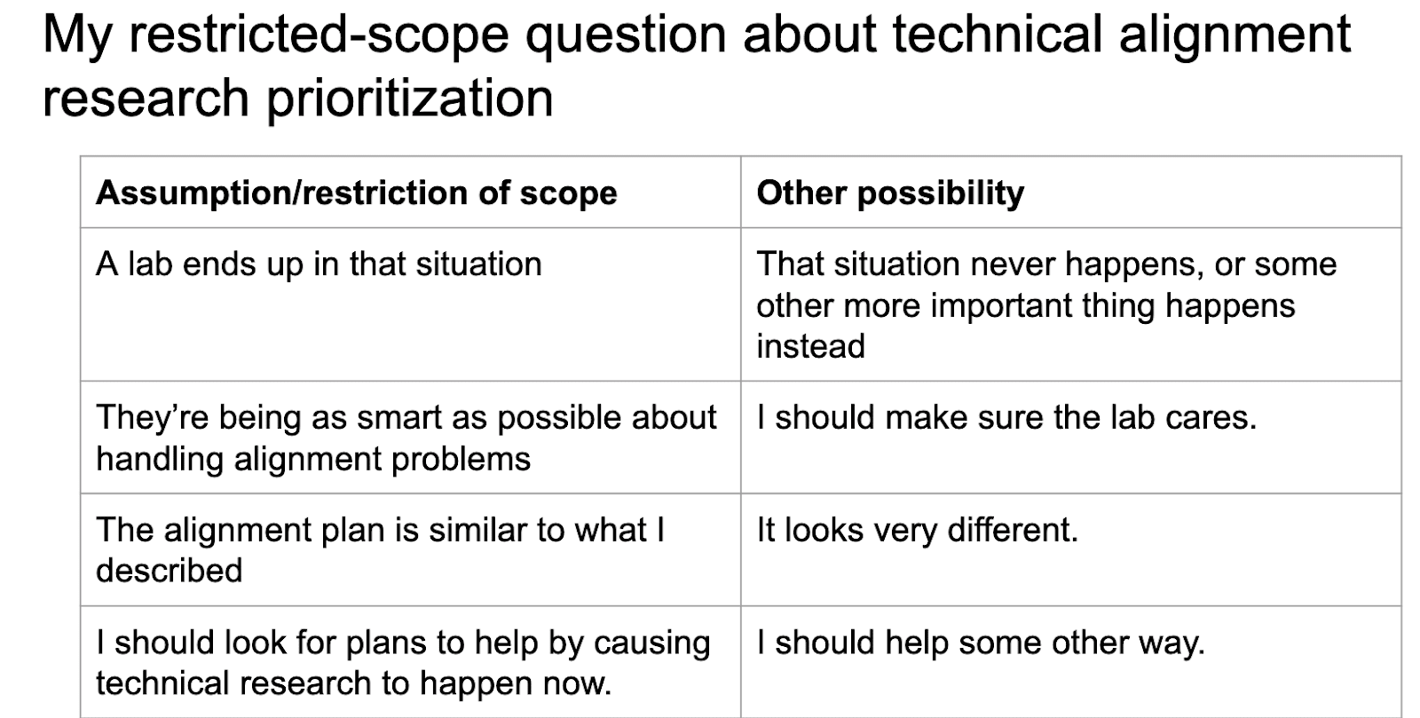 So the framework I’m going to talk about here is not that different, it doesn’t lead to very different things from other people. Re bullet point 2, I just personally like thinking about this stuff. It’s really not obvious whether in fact my research is better, because I try to ask myself the question like, “is this technique that we’re trying to research actually better than stuff which is just going to be in the plan by default?”