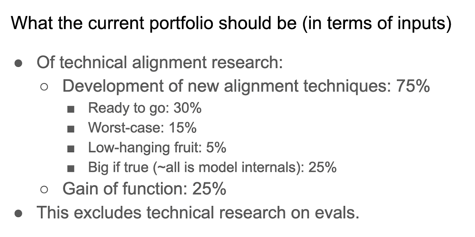 If I got to pick the current portfolio of alignment research, here’s what I’d pick. We’ve split it up by gain of function versus anything else, because the gain of function isn’t directly leading to new alignment technical research. Those are my numbers.