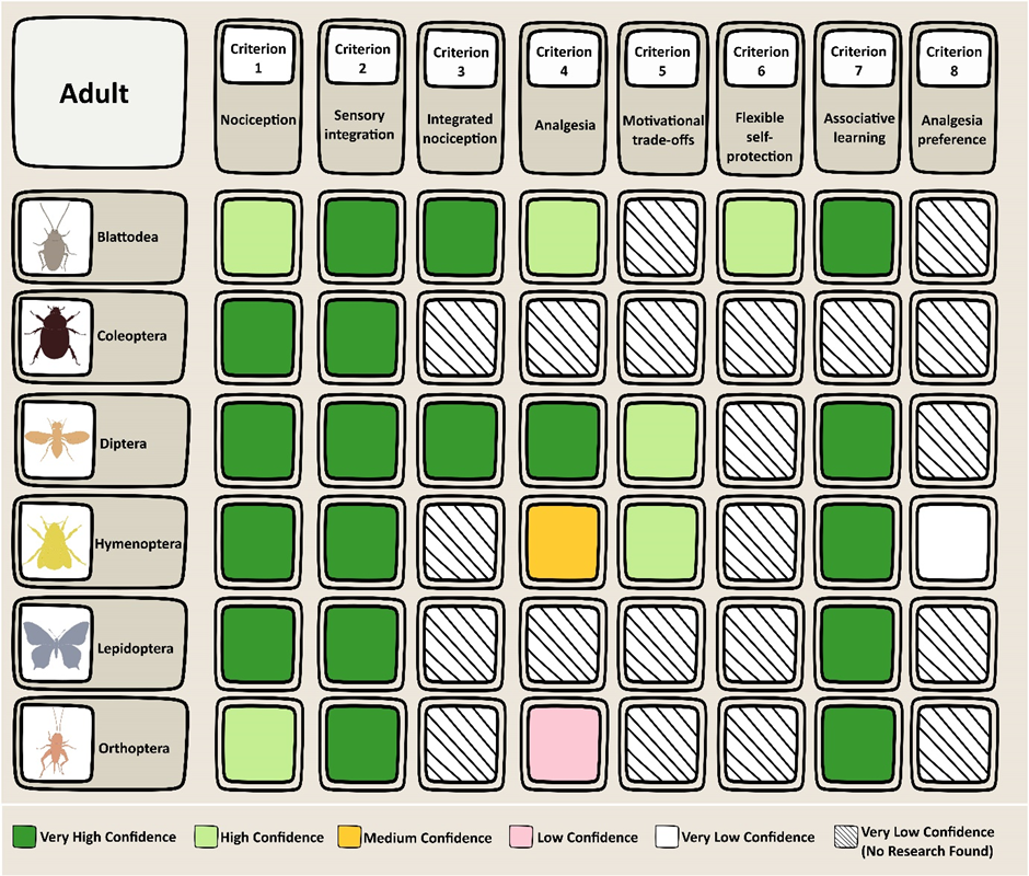 Adult Blattodea and Diptera meet 6⁄8 criteria to a high or very high level of confidence, constituting strong evidence for pain (see Table 1, below). This is stronger evidence for pain than Birch et al. (2021) found for decapod crustaceans (5/8), which are currently protected via the UK Animal Welfare (Sentience) Act 2022.