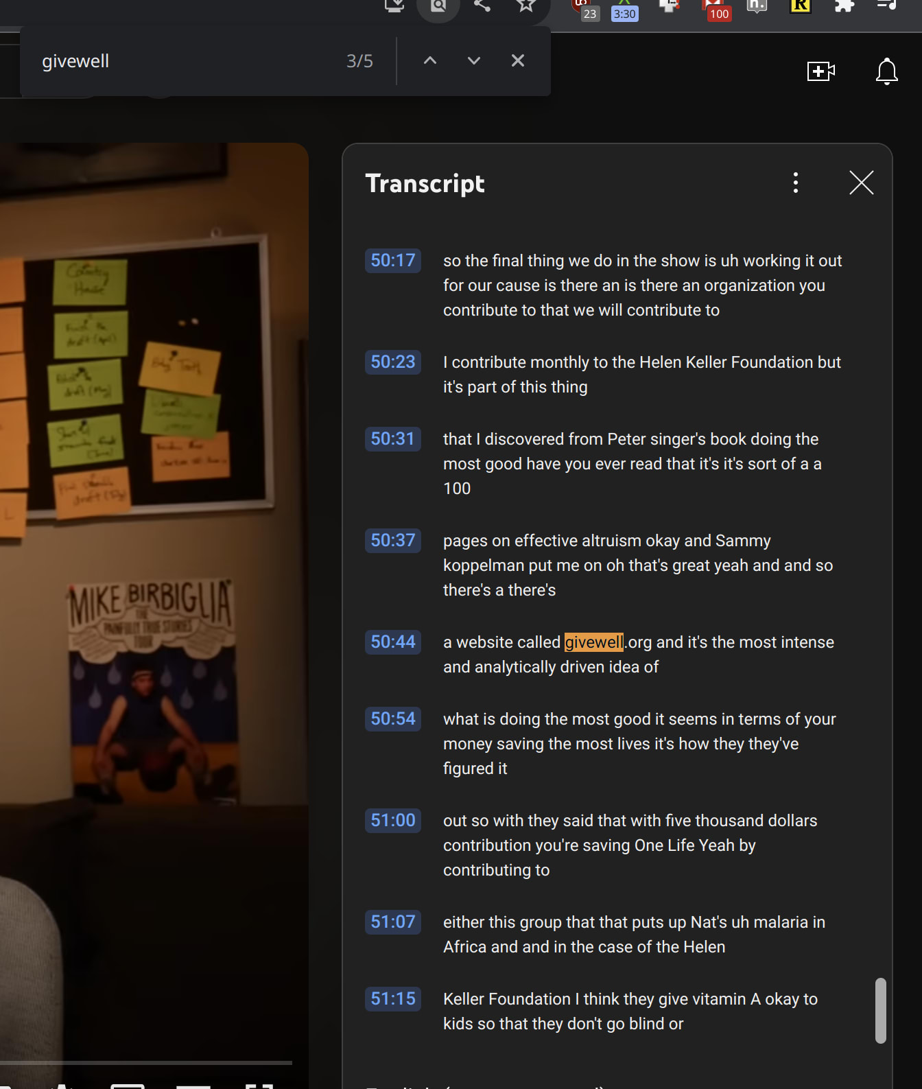 If you expand the description, you can click “Show transcript” and then search for givewell