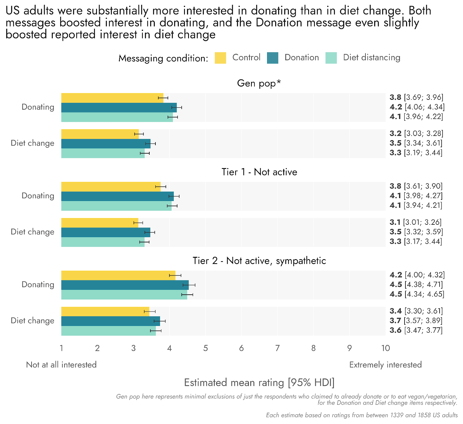 Figure 12: US adults were substantially more interested in donating than in diet change. Both messages boosted interest in donating, and the Donation message even slightly boosted reported interest in diet change