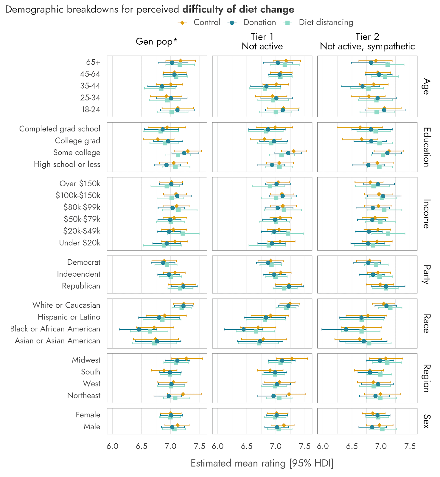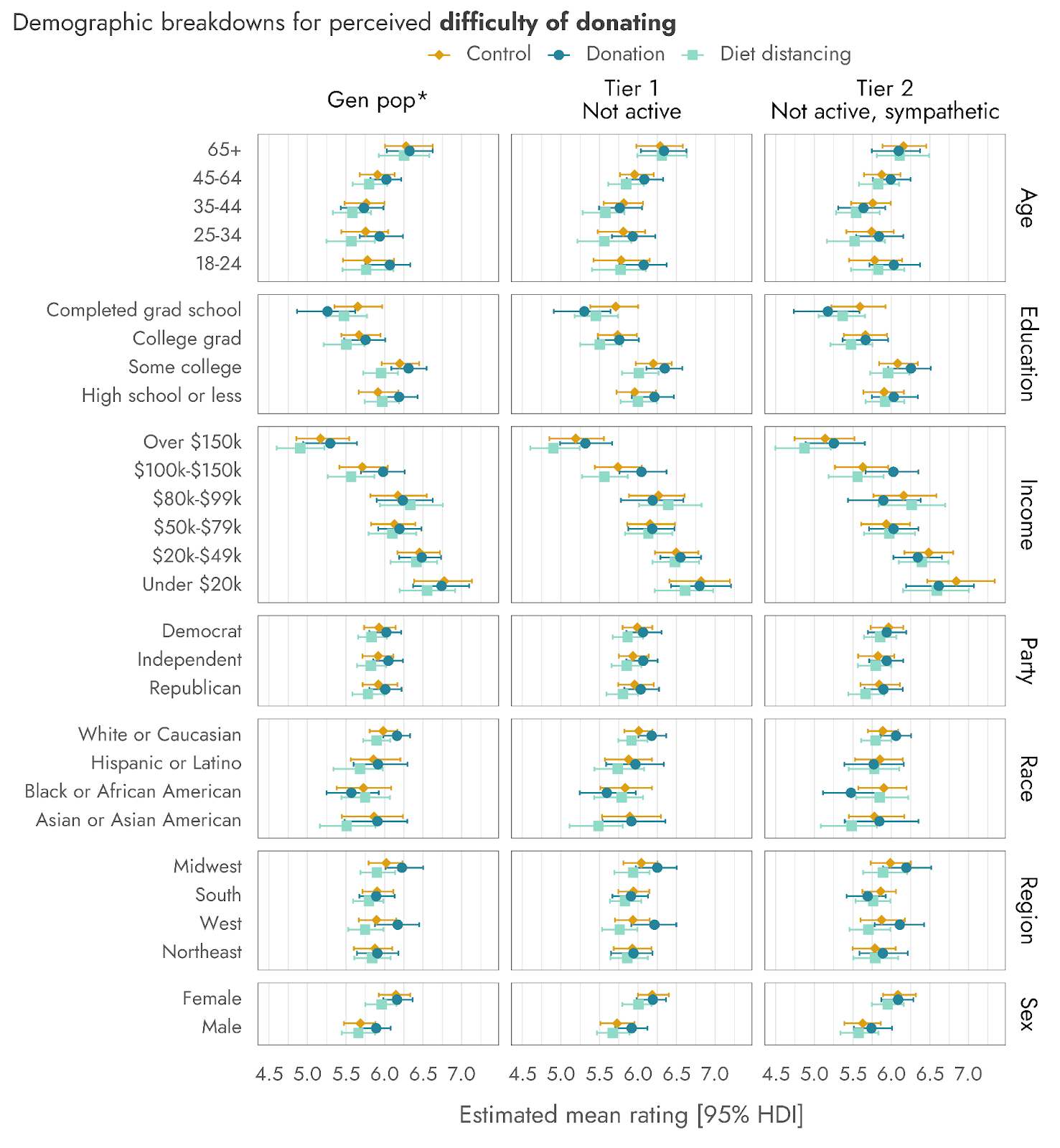 Figure 9: Neither message reliably impacted the reported difficulty of donating or of diet change, and respondents consistently rated donating as less difficult than diet change.