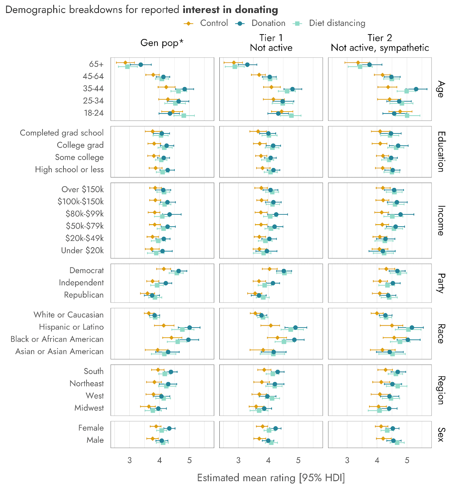 Results and analyses for the outcomes were split across some different tiers of inclusion. On the most inclusive level, we have results representative of the US adult population (‘General population’, or ‘Gen pop’ in graphs). For items that refer to Difficulty and Interest in engaging in the specified Diet change or Donation behavior, this General population level excludes those who reported already being vegetarian or vegan, or those who claimed to already be donating to such animal welfare-related charities, respectively (because they had the option to answer ‘not applicable, I already do this’).