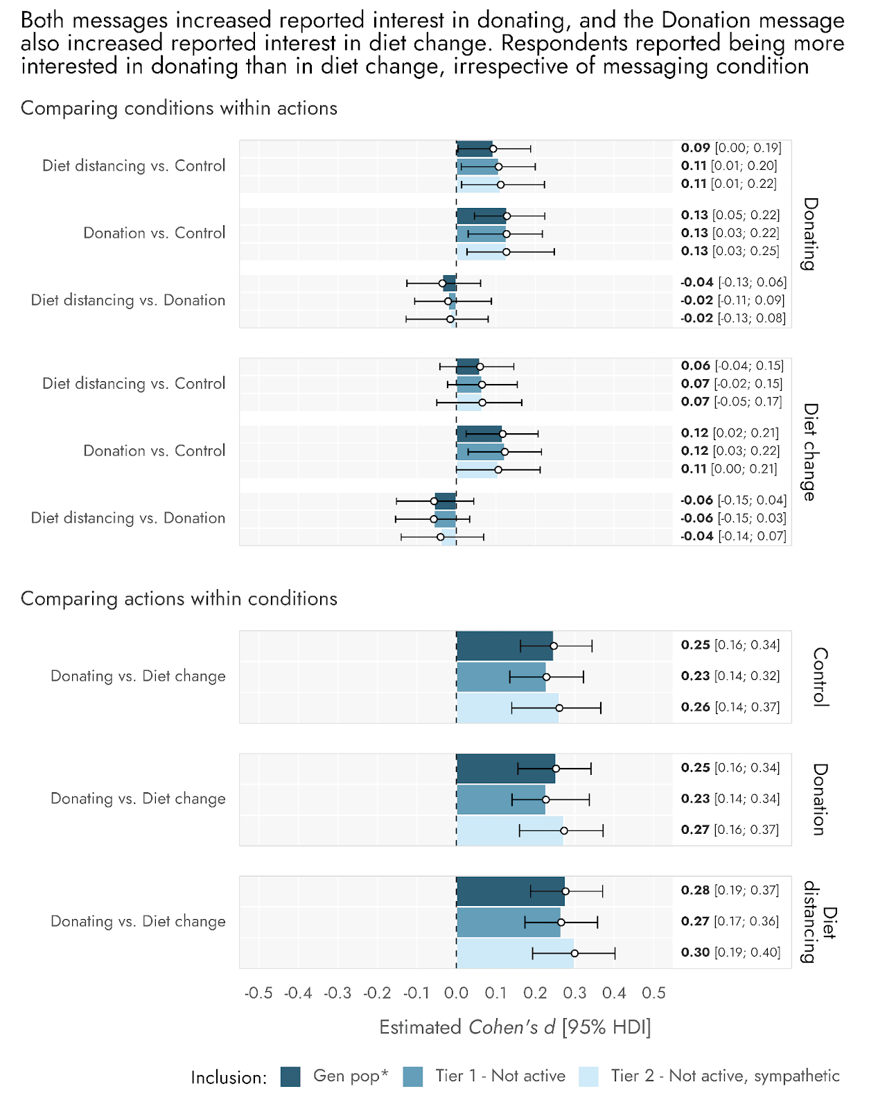 Respondents reported being more inclined towards donating than diet change, whether or not they received a message (approximately 0.7 points from 1-10, or 0.23 to 0.30 SD units), and Donation messages very slightly increased reported interest in diet change (around 0.3 points from 1-10, or 0.09 to 0.13 SD units), with the Diet distancing message directionally the same but smaller in magnitude (around 0.1 or 0.2 scale points, or 0.06 to 0.07 SD units).