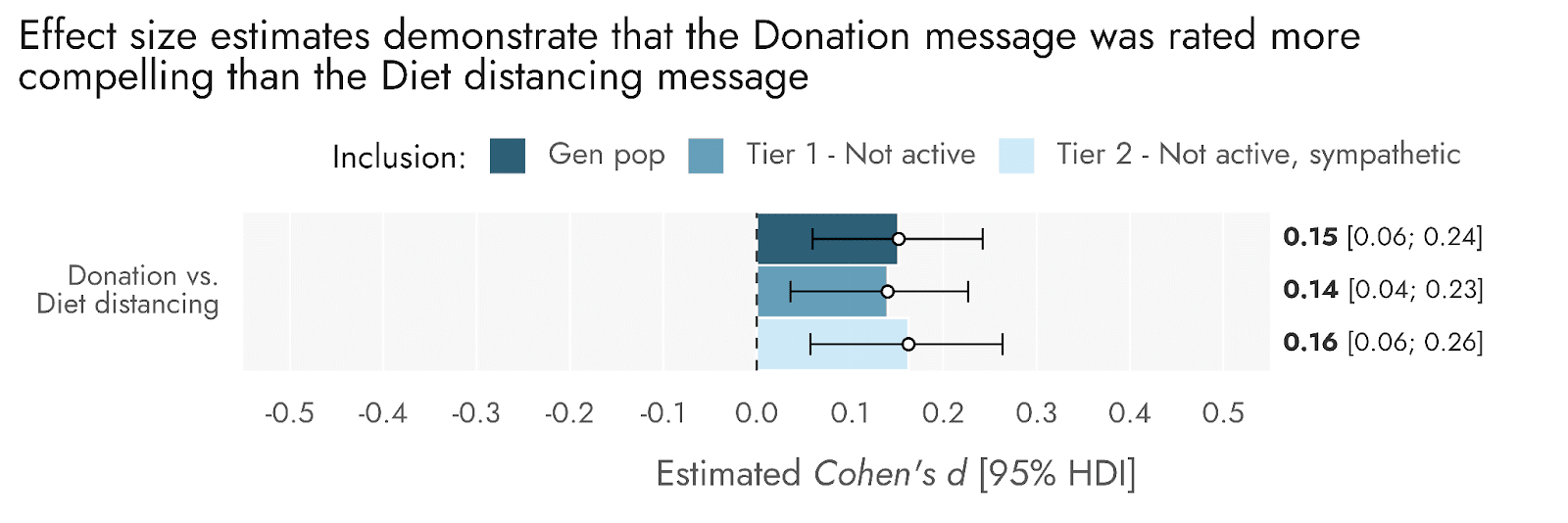 As shown in Figure 1, the Donation message was rated as more compelling than the Diet distancing message. The effect size for this difference is quite small at approximately 0.15 standard deviation units (Figure 2). As would be expected, Tier 2 respondents—who are sympathetic towards farmed animals as a cause area—also tended to find the messages more compelling than did the population at large.