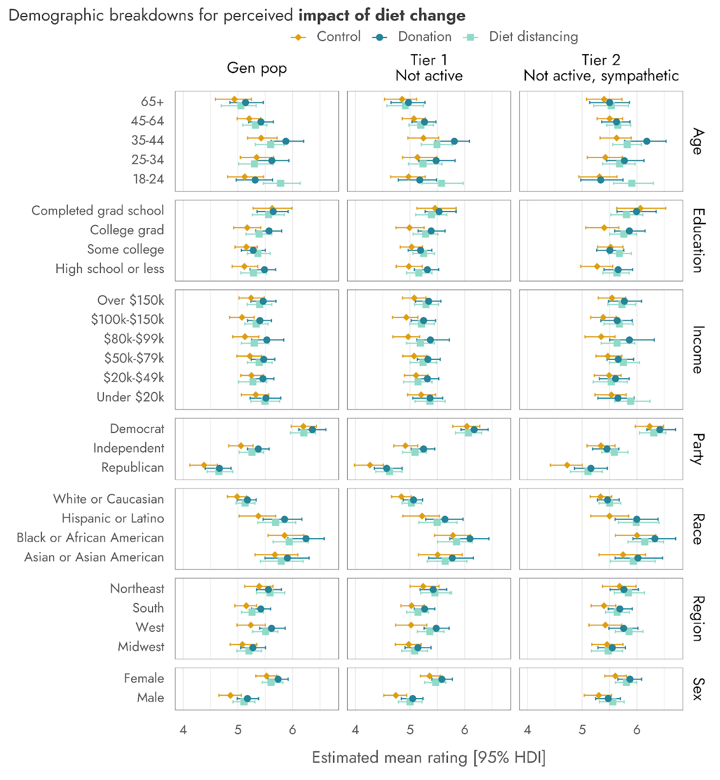 As with ratings of how compelling each message was, demographic breakdowns of impact ratings show that female respondents (vs. male) and Democrats (vs. Republicans) perceived both donating and diet change as more impactful (Figures 6 and 7). The perceived impact of donating was remarkably stable across income and education levels, whereas for diet change, there was a slight tendency for those with higher formal education to rate diet change as more impactful than the less formally educated. Both actions showed age trends, with older respondents finding donating less impactful, whereas for diet change there was a peak in impact ratings among those aged 35-44. Interestingly, among those predisposed to farmed animal welfare as a cause area, the age trend for donations is somewhat flattened.