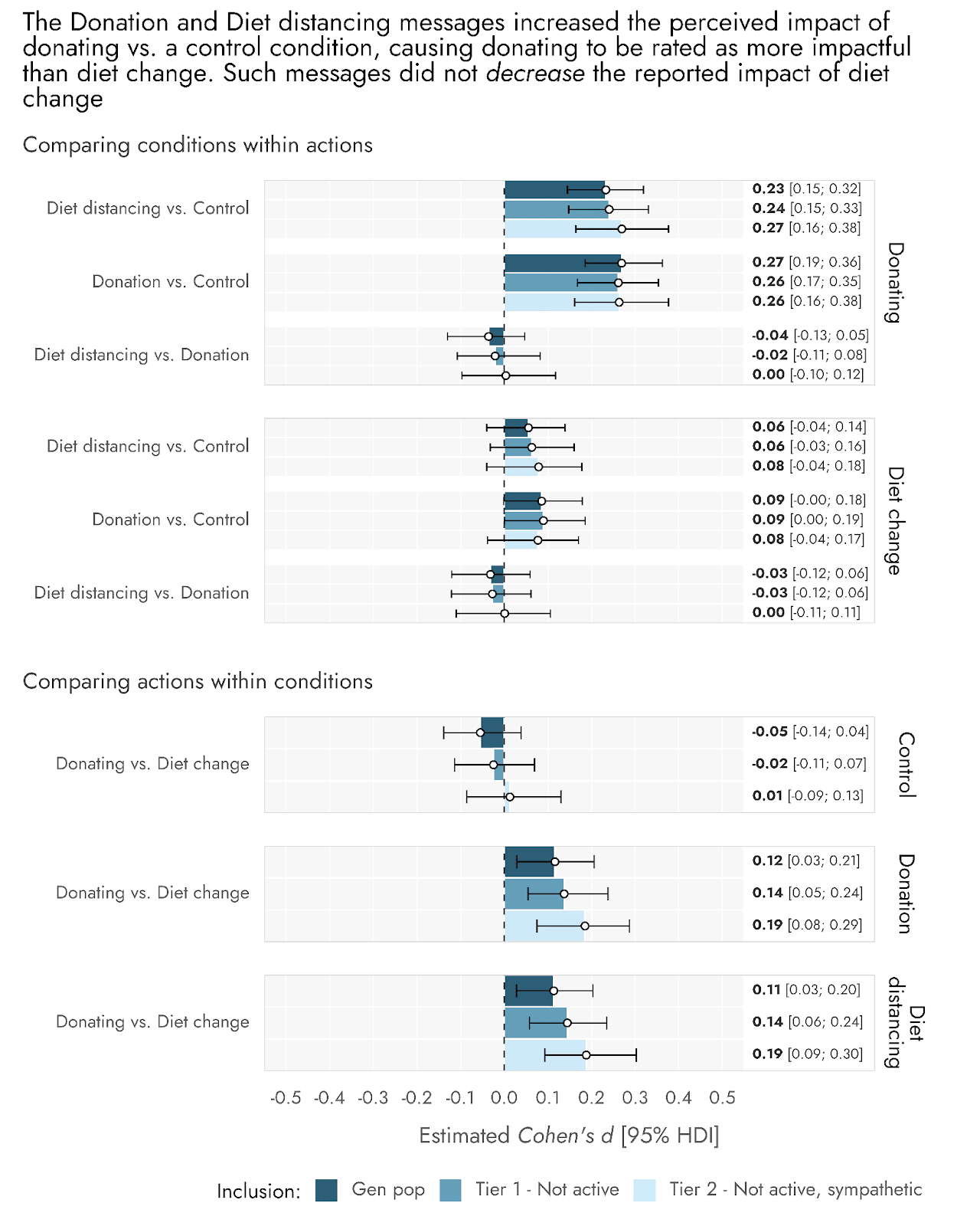 Both the Donation and the Diet distancing message increased the perceived impact of making donations, with a small to moderate effect size (Figures 4 and 5). As a consequence of these shifts, respondents who had been exposed to the messages rated donating as more impactful than diet change, whereas these actions were rated as equally impactful by those in the Control (no message) condition. Crucially, however, neither message reduced the perceived impact of diet change, and directionally, they even slightly increased the perceived impact of diet change.