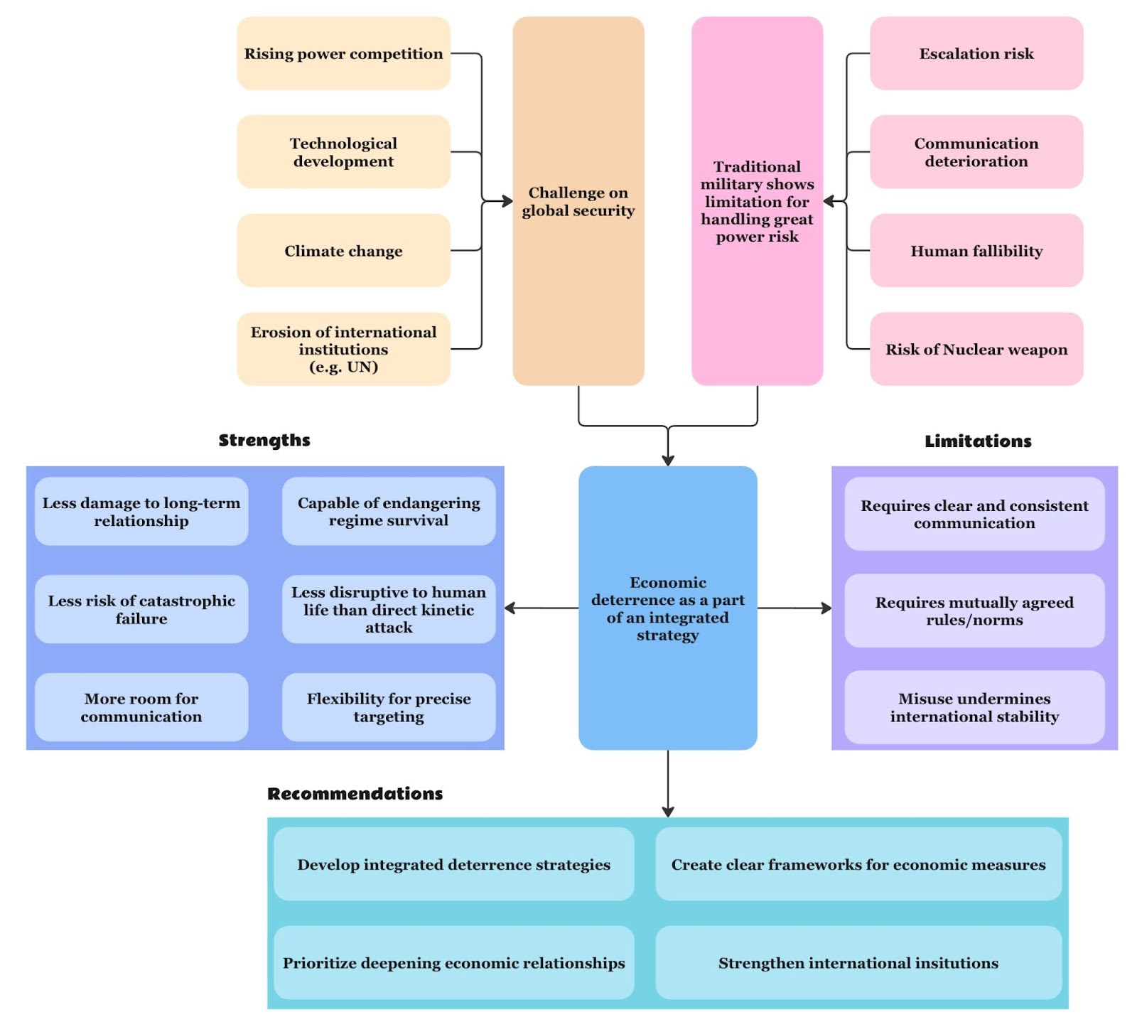 A successful economic deterrence strategy must be built on foundations that emphasize cooperation and integration for mutual benefit and restraint, alongside credible threats to discourage aggressive behaviour. This requires shifting from reactive sanction-based approaches to proactive frameworks that clearly communicate both consequences and benefits prior to any conflict. The framework should recognize that economic deterrence works best when perceived as legitimate by the international community, when applied between states or blocs of similar economic size, when there is clear transparency and public understanding, and when integrated into broader diplomatic efforts to maintain global stability.