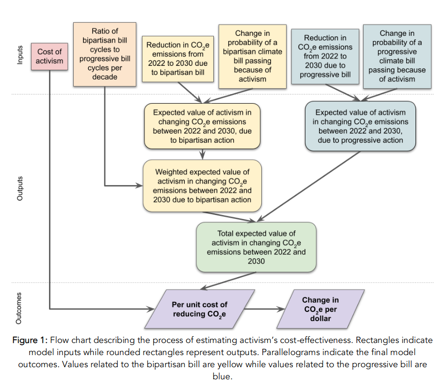 Impact and cost-effectiveness – We disagree with concerns over whether activism is actually impactful and cost-effective, and also think that progressive activism has a negligible likelihood of having a negative effect. After developing a CEA model of activism, we concluded the activism was extremely cost-effective in recent years. Activism is unlikely to have a negative effect because it would require (1) activism to have a negative impact on bipartisan bills and (2) bipartisan bills to be highly impactful at removing/avoiding emissions. While we admit some uncertainty (specifically around point 2), we do not think that either of these factors are likely.
