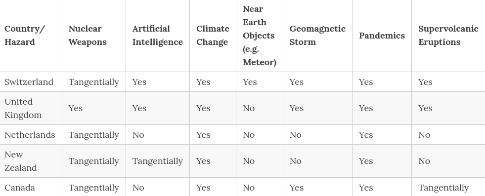 Table 1: Examples of countries that cover global catastrophic risks in their national risk assessments. “Tangentially” refers to the threat being mentioned, but not discussed further (1).