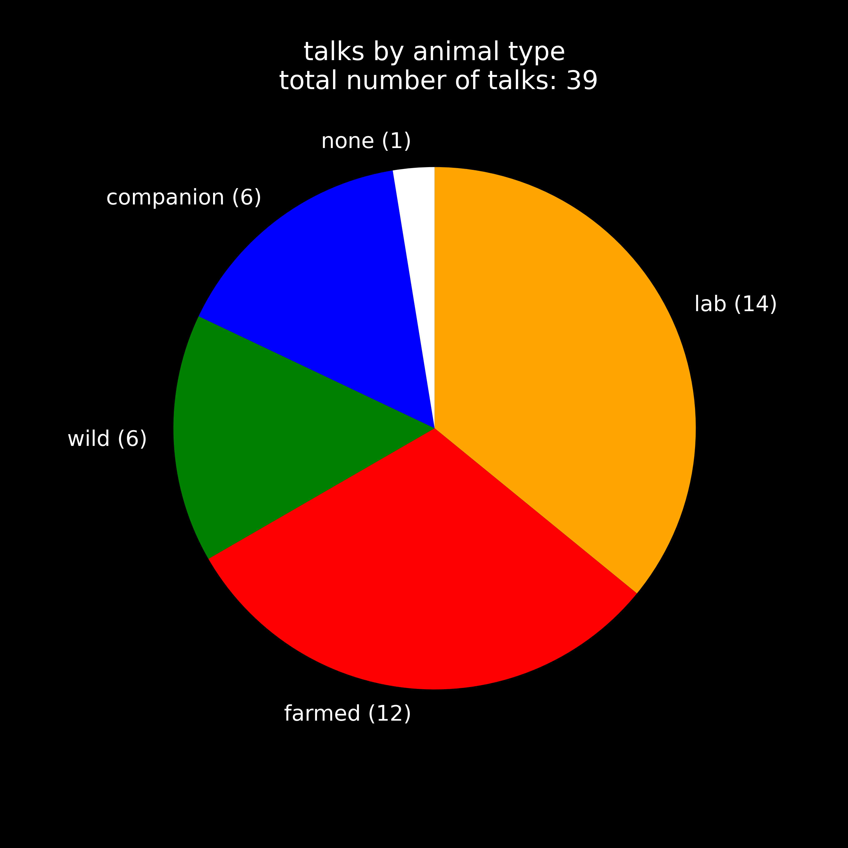 36% of talks and 12% of posters were about lab animals. If you are reading this, you probably know that the number of lab animals is insignificant when compared to the number of farmed animals. However, clearly, lab animals are studied a lot, especially by researchers who use them.