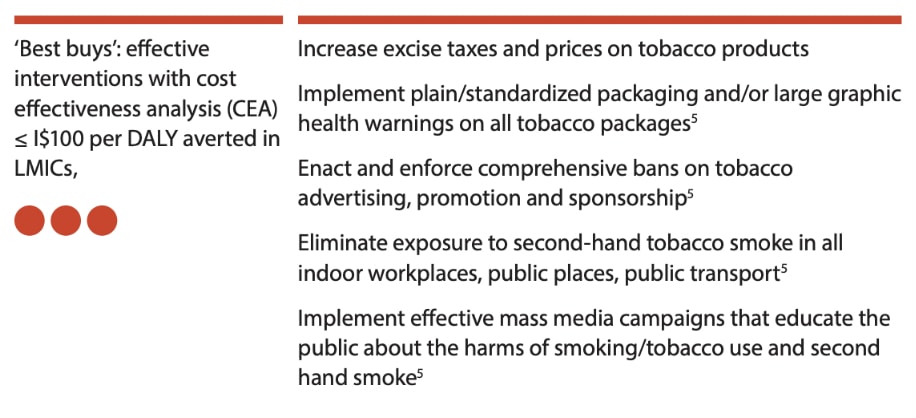 1) Introduce comprehensive tobacco control legislation in Guinea-Bissau — [Potential to] avert 113,467 DALYS / 15 years (EV: ~$18/DALY), ~9,813 lives saved