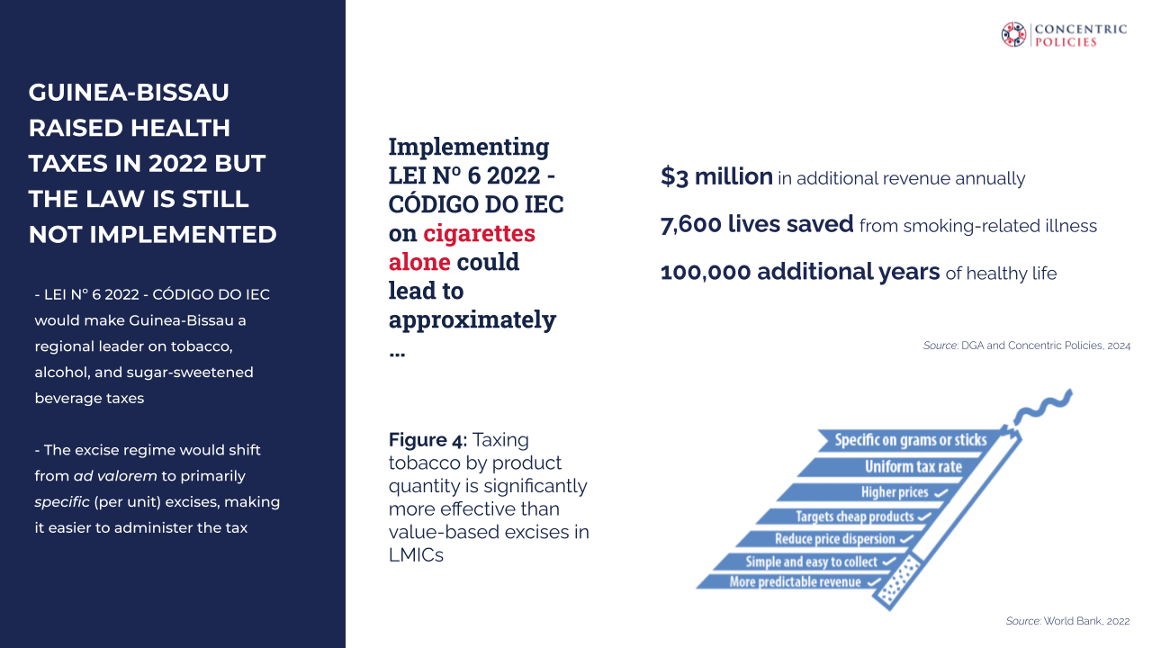 With $5,000 − 15,000 in additional funds, we could develop a technical roadmap and administrative regulations for implementing higher taxes on tobacco, alcohol, and sugary drinks in Guinea-Bissau.