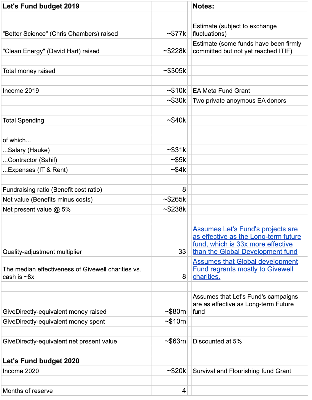 In early 2019, we first got funding for Let’s Fund and Hauke, the CEO and research lead, started full-time work on this project. In mid-2019, Sahil contracted for Let’s Fund part-time for a few months to work on business operations and has since volunteered. Henry volunteered part-time for the project. Overall, roughly one year of full-time equivalent (FTE) has been spent on the project, since our launch 14 months ago.[1] Our CVs are at Lets-Fund.org/About.